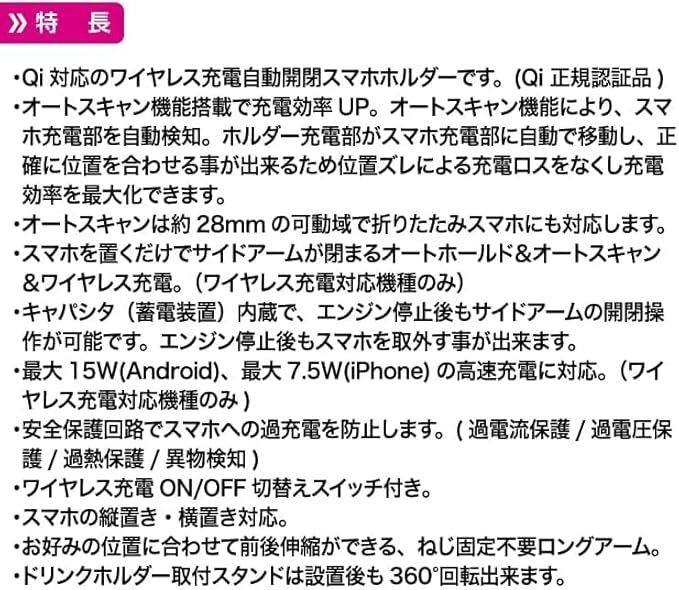Qi対応のワイヤレス充電自動開閉スマホホルダーです。(Qi 正規認証品)スマホを置くだけで高速充電できます。