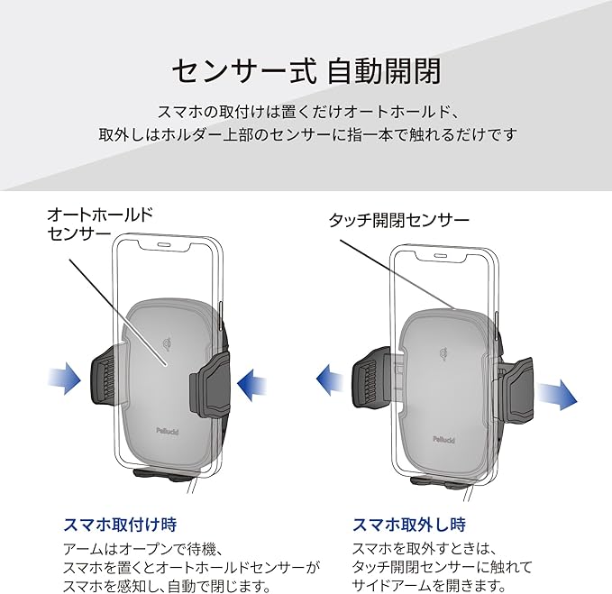 スマホ取付時、スマホを置くとオートホールドセンサーがスマホを感知し自動で閉じます。スマホ取り外し時、タッチ開閉センサーに触れるとサイドアームが開きます。センサーに触れる事によりアームがオープンするので誤作動でアームが開き大切なスマホが落下する心配がないので安心です。