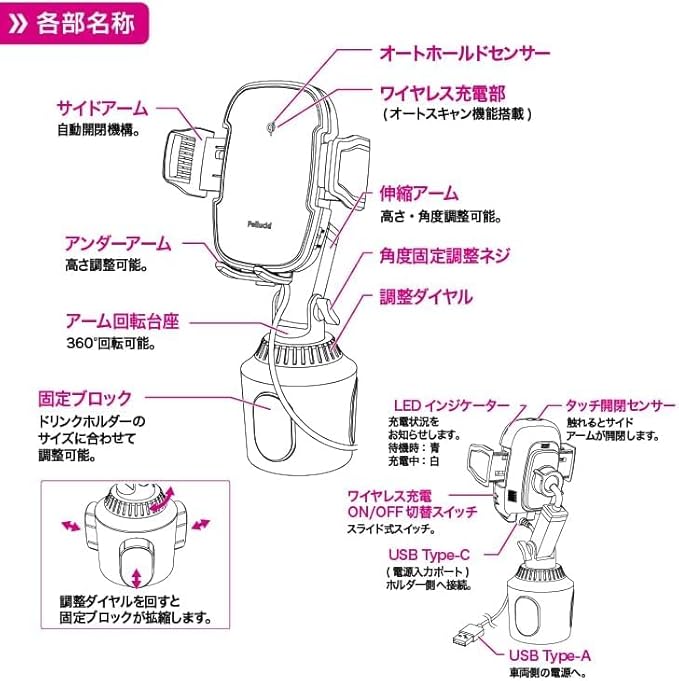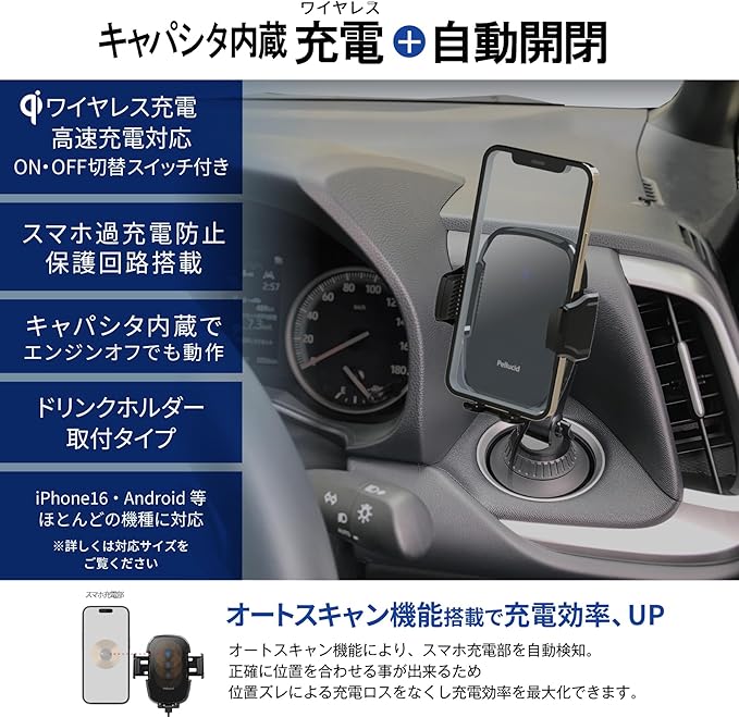 高速ワイヤレス充電+自動開閉+キャパシタ+オートスキャン機能搭載 ペルシード車載スマホホルダー ドリンクホルダー取付タイプ PPH2305