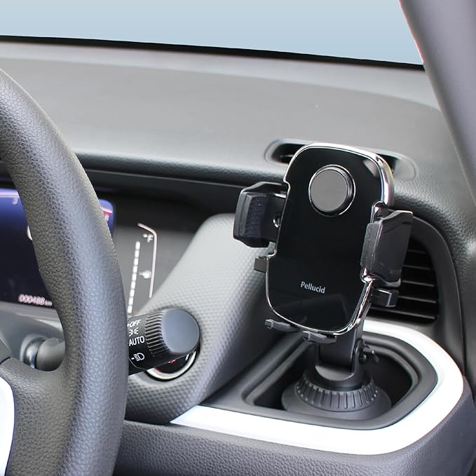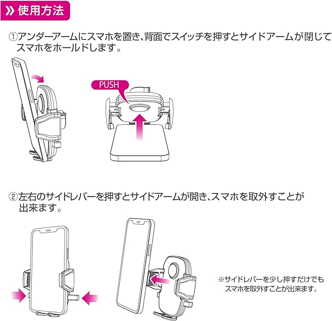 スマホを押し当てるだけのワンタッチホールド式スマホホルダーです。手帳型ケースにも対応。サイドレバーを少し押すだけで、スマホの取外しが可能です。