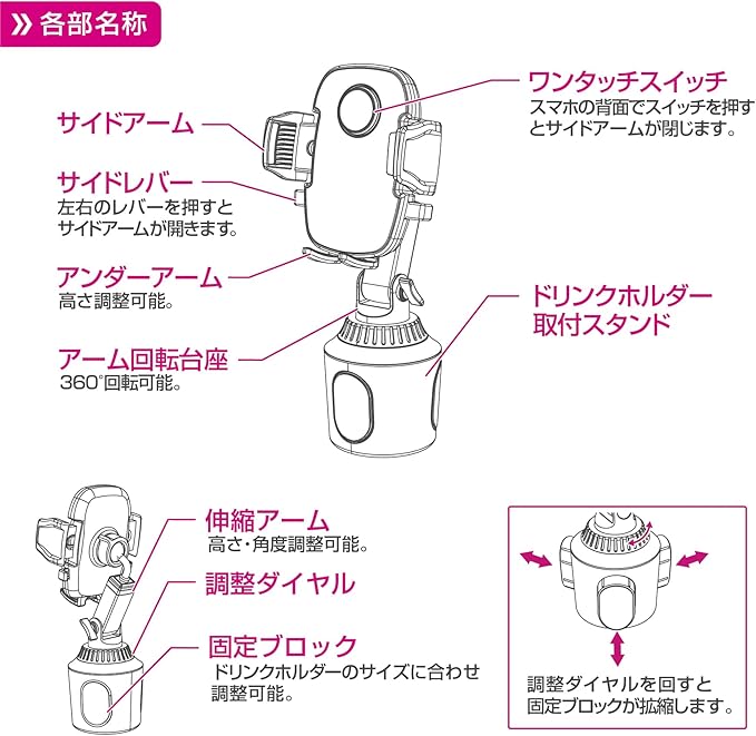 【対応スマホサイズ】幅:約55~88mm/厚み:約20mmまで/ホルダー部耐荷重:約280g以下【セット内容】ホルダー本体 1/ドリンクホルダー取付スタンド 1/取扱説明書