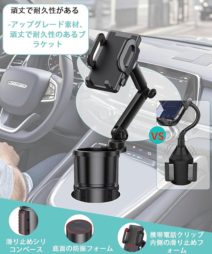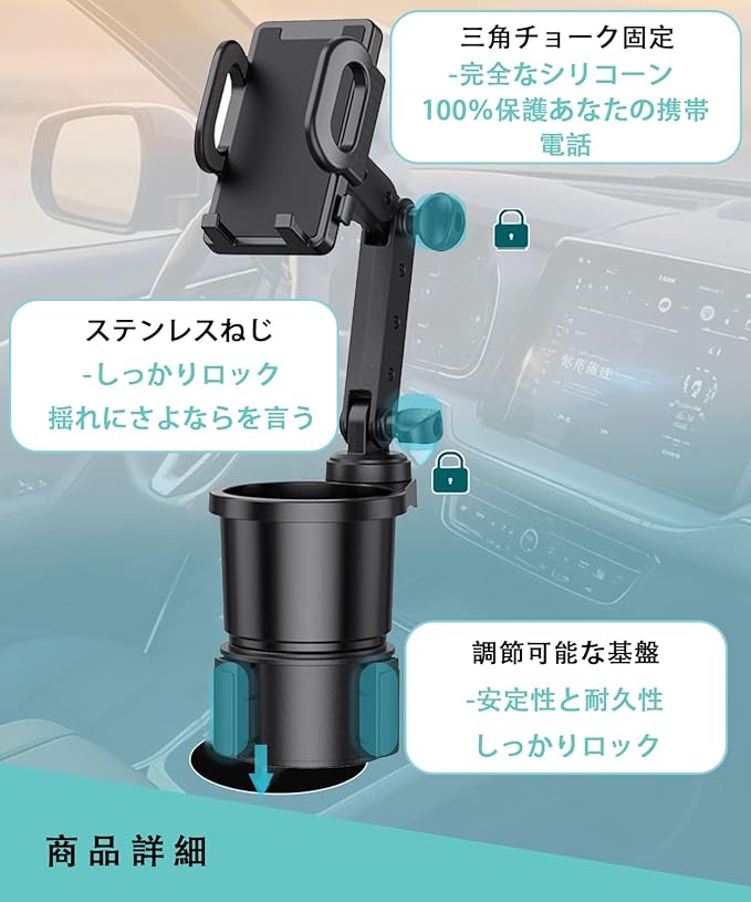 【安定防振設計】 二重調整可能なサポートアームを採用し、ダイヤルでしっかりロック。揺れる道でもスマホがぐらつかず、落下防止。スマホスタンド部分はカップホルダー構造にフィットし、二重固定でより安定。