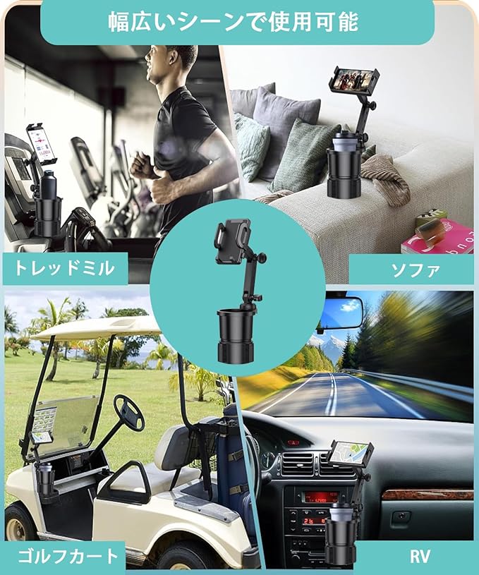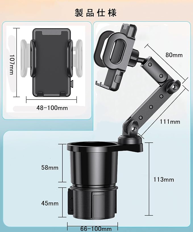 【高い互換性】 伸縮式ベースで直径約6.5~10cmのカップホルダーに対応。SUV、トラック、キャンピングカーからゴルフカートまで幅広く使用可能。スマホホルダー幅は48~100mmで、ケース付きのスマホもしっかり固定。