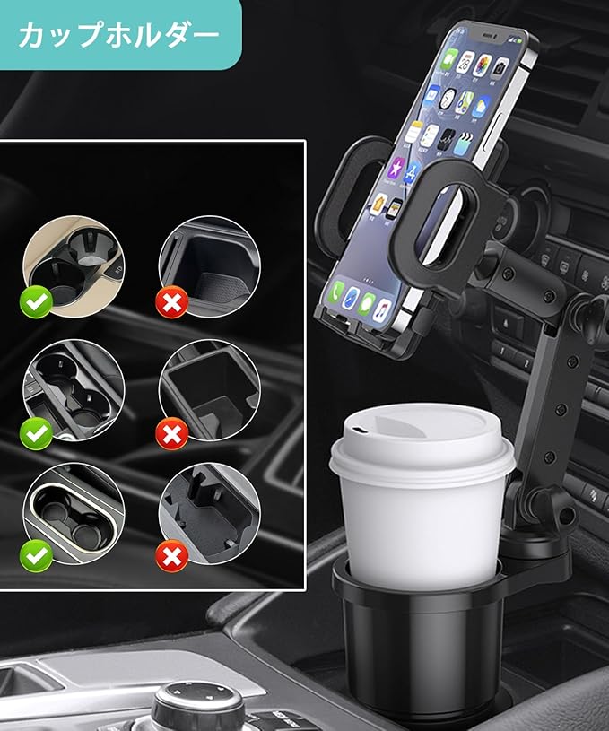 スマホホルダー 2in1 カップホルダー 携帯電話スタンド カップホルダー付き携帯電話ホルダー ドリンクホルダー 車載スマホホルダー カップスタンド 車用カップ 360度回転 方向自由 調節可能 マウント 多機種に対応 スマートフォン用 車用 | KAZESHOP