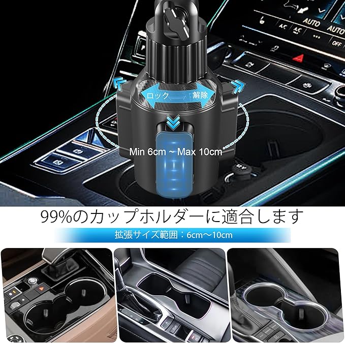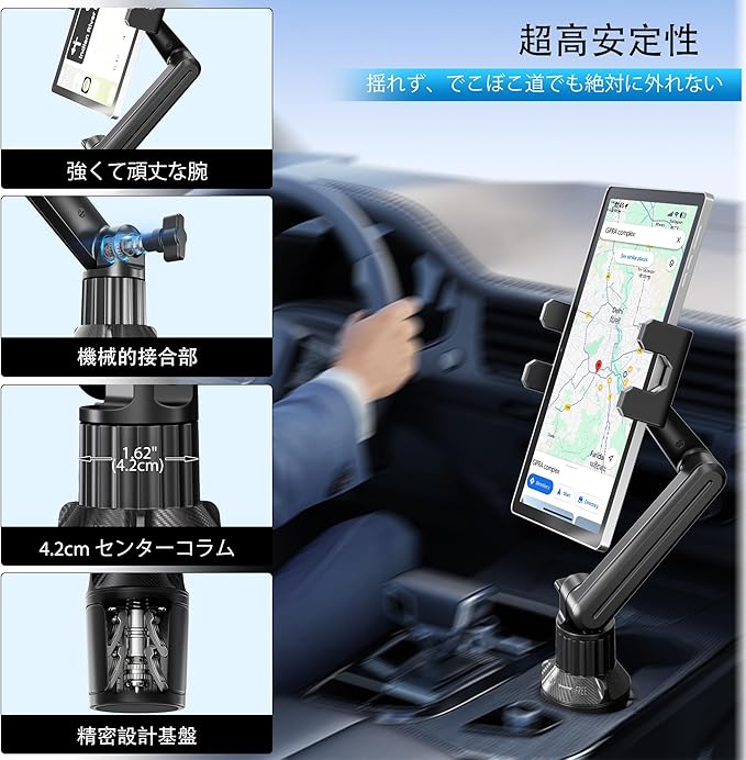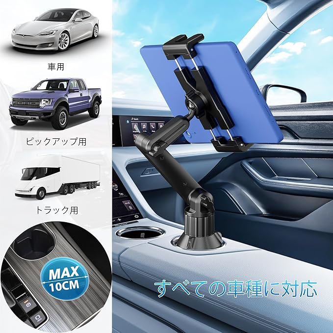 【ほとんどの車に対応】 当社の車用タブレットホルダーは、拡張可能なベースを採用し、2.36インチから3.94インチ(60mm-100mm)まで調整可能で、ほとんどの車、トラック、SUV、ボートのカップホルダーにぴったりフィットします。3つのゴム製爪が安定した三脚グリップを形成し、頑丈なマウントベースを固定するため、凸凹した道路でも揺れたり倒れたりしません。ご購入前に、お車のカップホルダーの直径が2.36インチから3.94インチの間であることをご確認ください(円形カップホルダーに対応、四角形カップホルダーには不適)