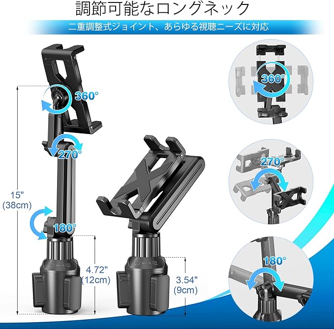 高さ・角度調整可能】カップホルダーカータブレットマウントのアームは、4.7インチから15インチまで延長可能です。タブレットホルダーはボールヘッドサポートで360 回転可能で、デバイスを水平・垂直モードで固定できます。柔軟なアームは270 と180 のジョイントを備え、視界を妨げずに最適な視聴角度を実現します