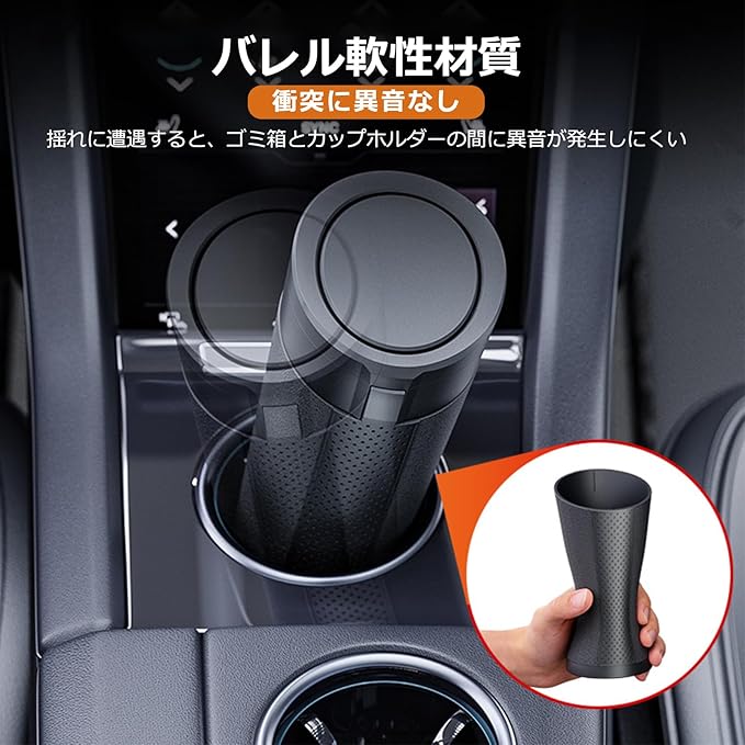 【静音設計でドライブ中も快適】 「車が揺れるたびにカチャカチャ音がする…」本体には減衰TPE素材を使用し、カップホルダーとの接触音を抑制。さらに小ゴミ専用スロット+広口ボタンを搭載し、ウェットティッシュや果物の皮なども静かに捨てられます。静かな車内で運転に集中できます。