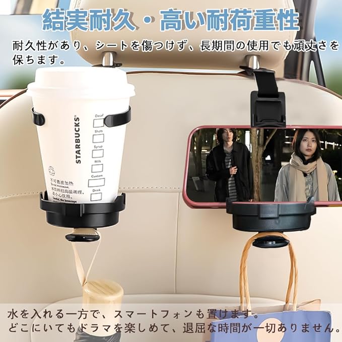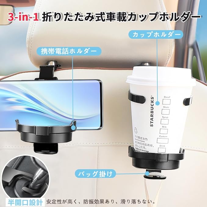 1.こちらの3合1多機能デザインの車載フックは、後部座席に取り付けることで、カップホルダー、ハンドバッグフック、スマホスタンドの機能を兼ね備えています。特にお子様のいる家庭に適しており、子供の水筒やボトル、小さなおもちゃなどを置くのに便利です。