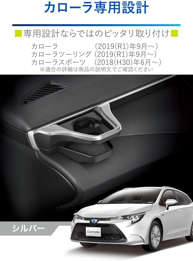 カローラ(2019(令和元)年9月~) / カローラツーリング(2019(令和元)年9月~) / カローラスポーツ (2018(平成30)年6月〜)/GRカローラ(2023(令和5)年3月~)の右ハンドル車、助手席側専用に設計・デザインされたドリンクホルダーです。