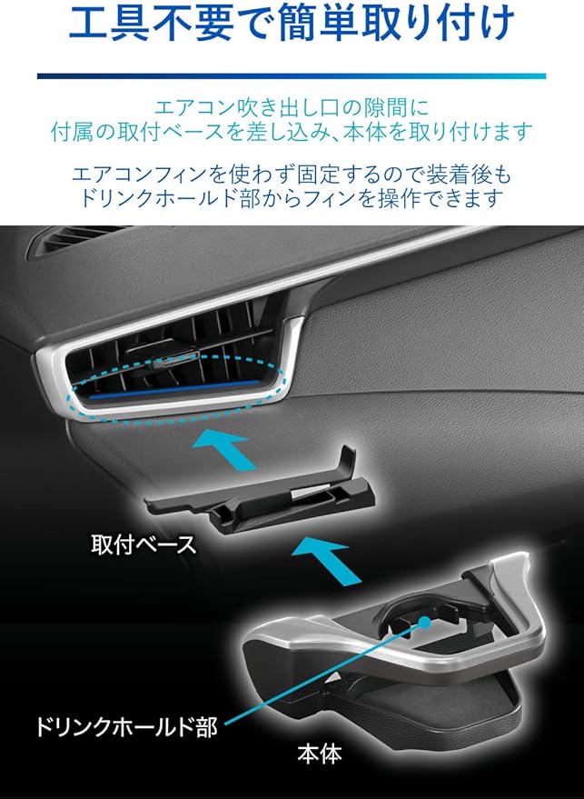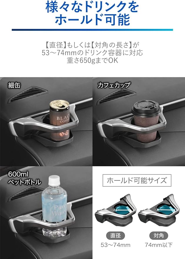 【様々なサイズのドリンクをホールド可能】上から見た時に【直径】もしくは【対角の長さ】が53~74mmのドリンク容器に対応しています。(底から上部にかけて広がるカフェカップやチルドカップ等の場合、底から79mmの位置でのサイズが74mm以下であること。) また、細い缶もホールドできるようにするためホルダー内側にフラップが付いています。【スポンジクッション付き】ドリンクホルダーの底面にはスポンジ素材のクッションを備えているので、走行中にドリンクがガタついてカタカタ音がするのを防ぎます。※クッションはスポンジ素材ですが、飲み物の結露や飲みこぼしを吸水するような吸水性はありません。【工具不要で簡単取り付け(取り付け所要時間の目安:8分)】エアコン吹き出し口の隙間に付属の取付ベースを差し込み、本体を取り付けます。工具不要なため、簡単に取り付けることができます。