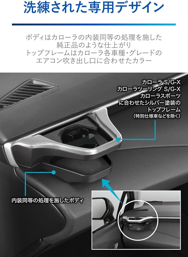 【ドアミラーの視界をさまたげない専用設計】一般的なエアコン吹き出し口に取り付けのドリンクホルダーは、ドリンクを置いた際に助手席側のドアミラーが見えなくなる場合があります。本製品はカローラ専用設計のため、助手席側ドアミラーの視界をさまたげないような位置に設置できます。(ただし、ドライビングポジションが前方側の場合は、大きいサイズのドリンクを置くとドアミラーの視界をさまたげる場合があります。その場合は、ドアミラーの視界をさまたげないように細い缶など背の低いドリンク等のみ置いてください。)