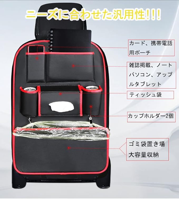 ⭕【収納袋&ゴミ袋】車載ゴミ箱として、食べ物や飲み物、ティシュー、赤ちゃんのおむつ、嘔吐物などのゴミに対応できます。また、ゴミケースの代わり小物入れとして使用も可能です。ケーブル、携帯、本、子供の玩具、お菓子などの小物を収納できますので、 車が綺麗になり清潔感を保ちます。
