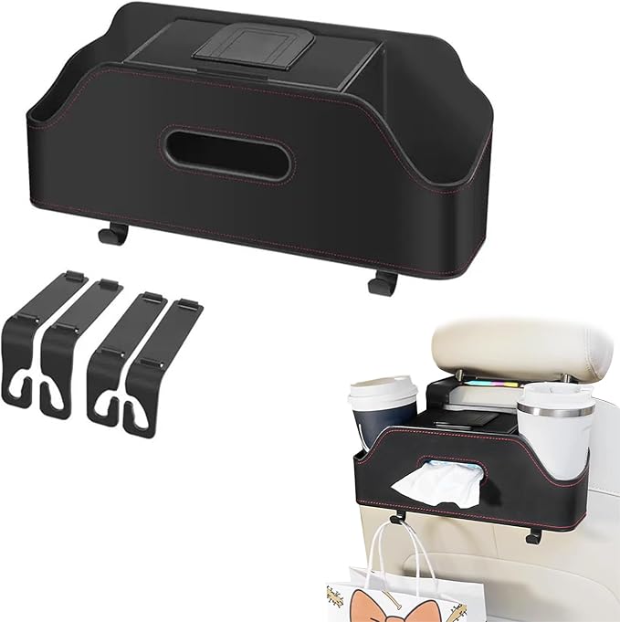車用多機能収納ボックス ティッシュホルダー 車 後部座席用ドリンクホルダー 多機能車用収納ボックス 蓋はポップオープンデザインを採用 2個カップホルダー 携帯電話ホルダー付き 車内用品 小物入れ PUレザー 収納便利 省スペース 取り付けが簡単 自動車シートバックオーガナイザー 運転席と助手席兼用 (ブラック) | KAZESHOP