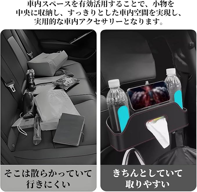 【車用多機能収納ボックス】:このカーオーガナイザーは、多用途に使えるカーアクセサリーです。ティッシュホルダー、スマートフォンホルダーが一体化しており、2つのカップホルダー。ドリンク缶やコーヒーカップの収納、スマートフォンやタブレットの収納など、車内でのあらゆるニーズに応えます。
