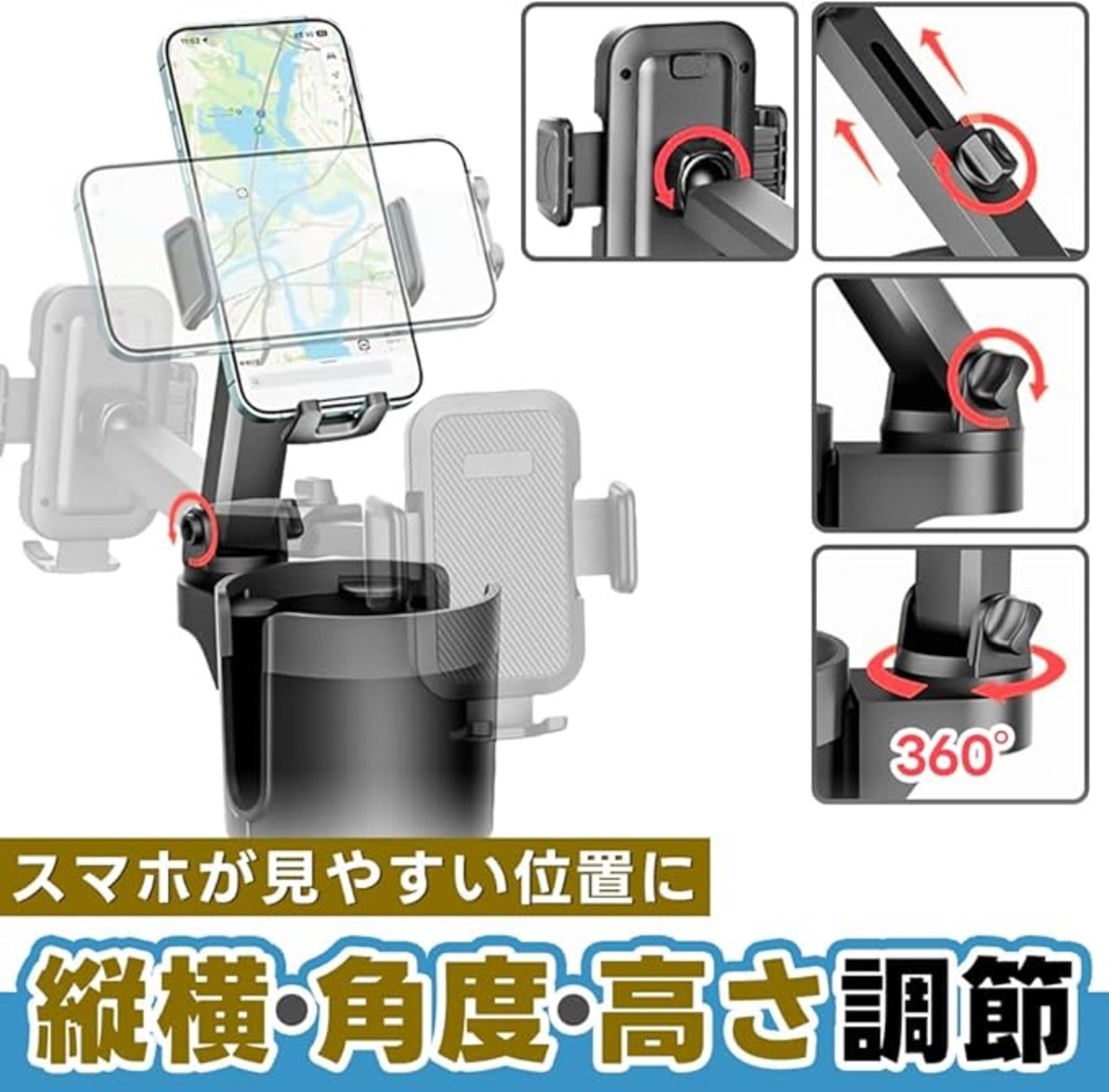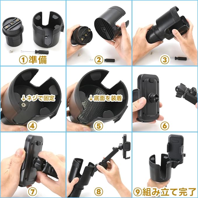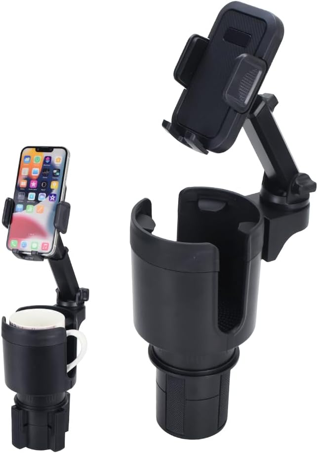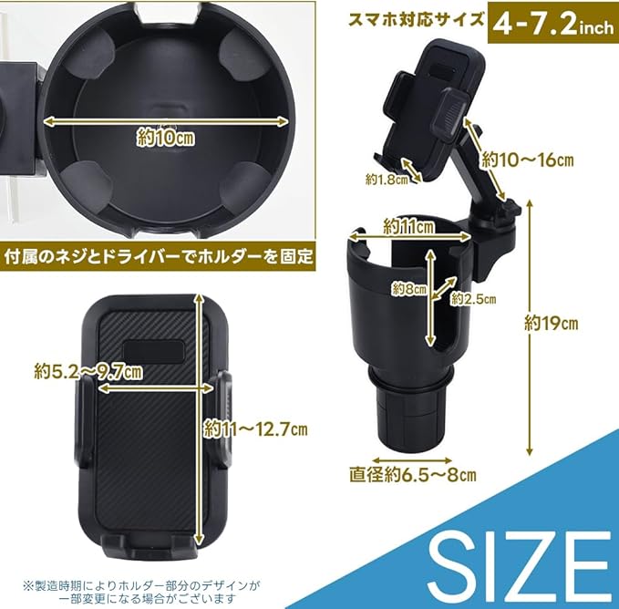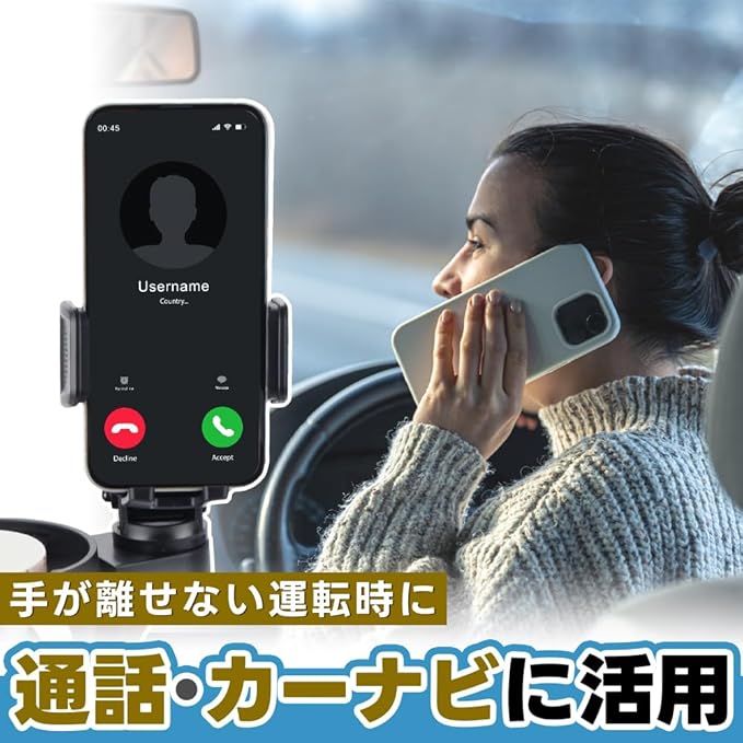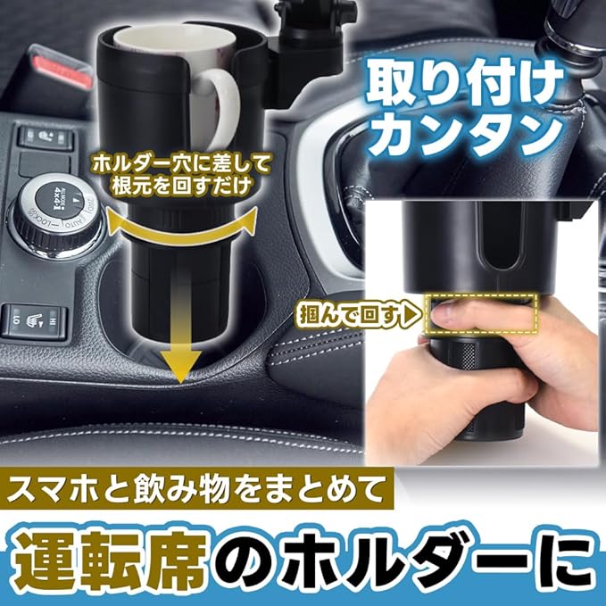 ✅スマホと飲み物を一緒にセットできる車載2in1ドリンクホルダーです。設置方法は簡単で、車内のセンターコンソールにあるカップホルダーに差し込むだけ!下部には伸縮式のアジャスターを完備しているので、本体を回すことでズレないように幅を調整できます。