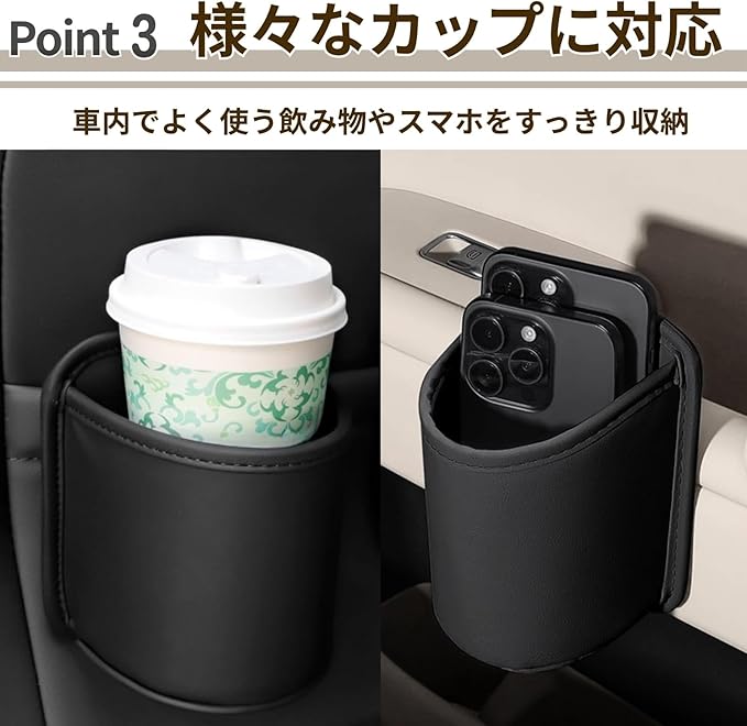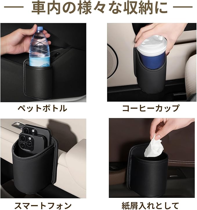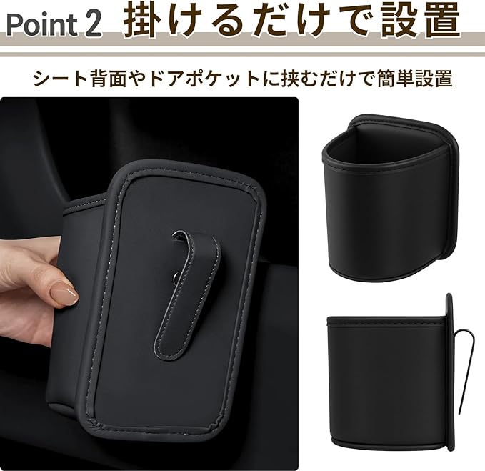 【引っ掛けて使える】シート背面やドアポケットに掛けるだけで簡単に設置可能です。取り外しも簡単なので、必要な時にだけ着けておくことができます。
