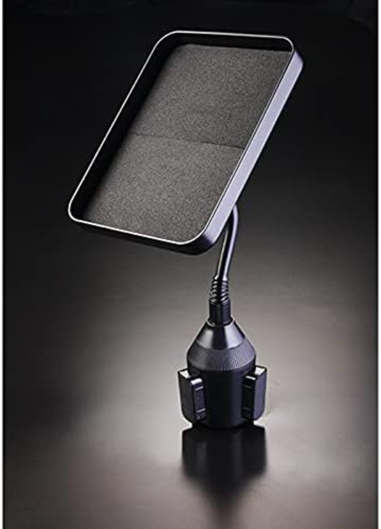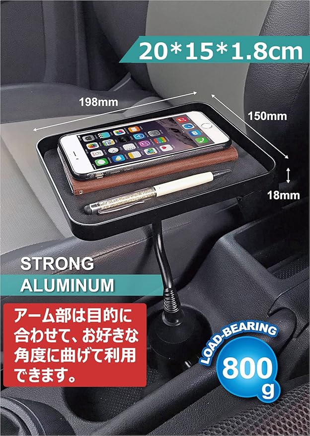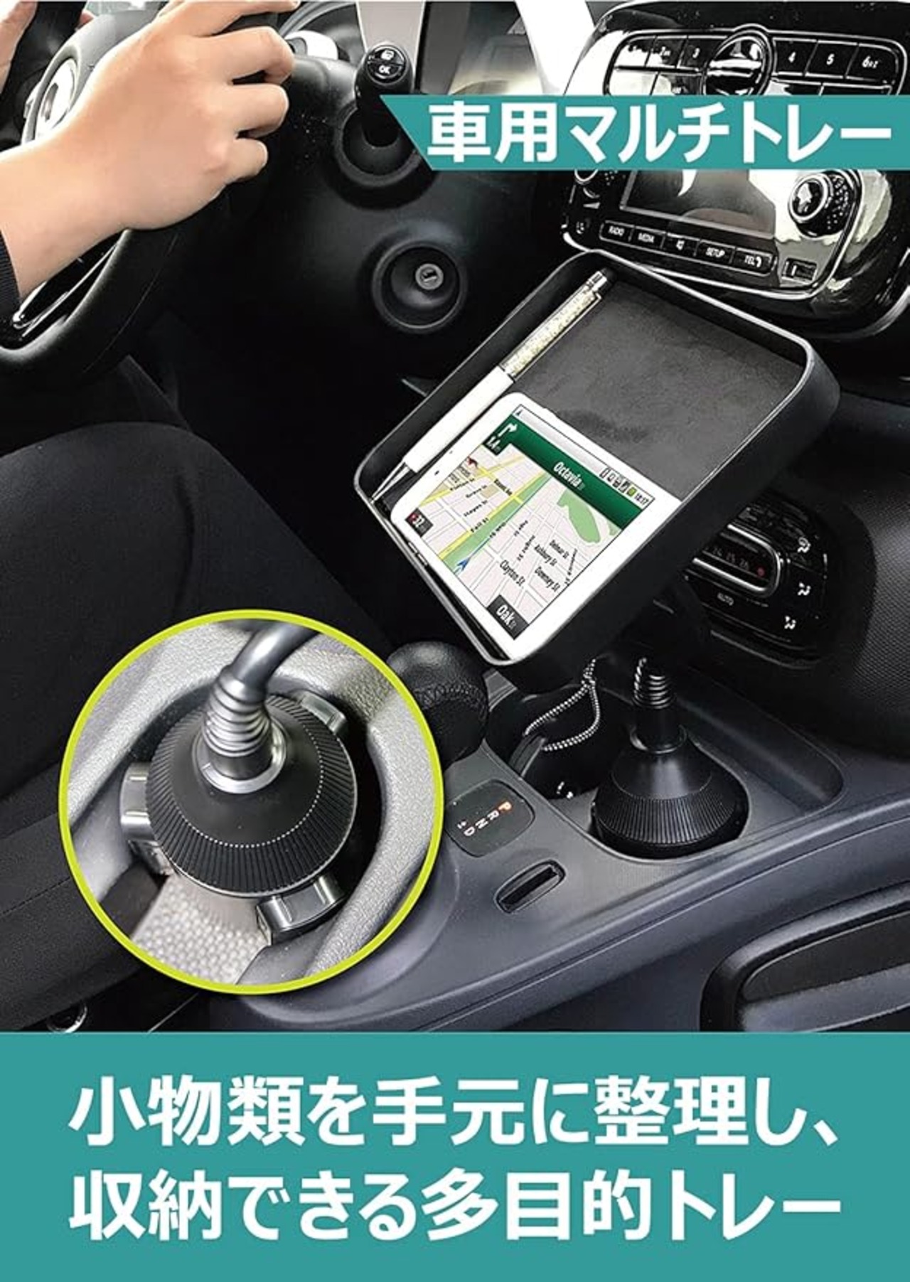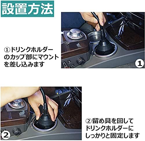 車のドリンクホルダーに設置できる小物置き。取付台座はクルクルと回して受け側の直径に合わせてサイズ調整することで、どんなお車にもしっかりとジャストフィット。