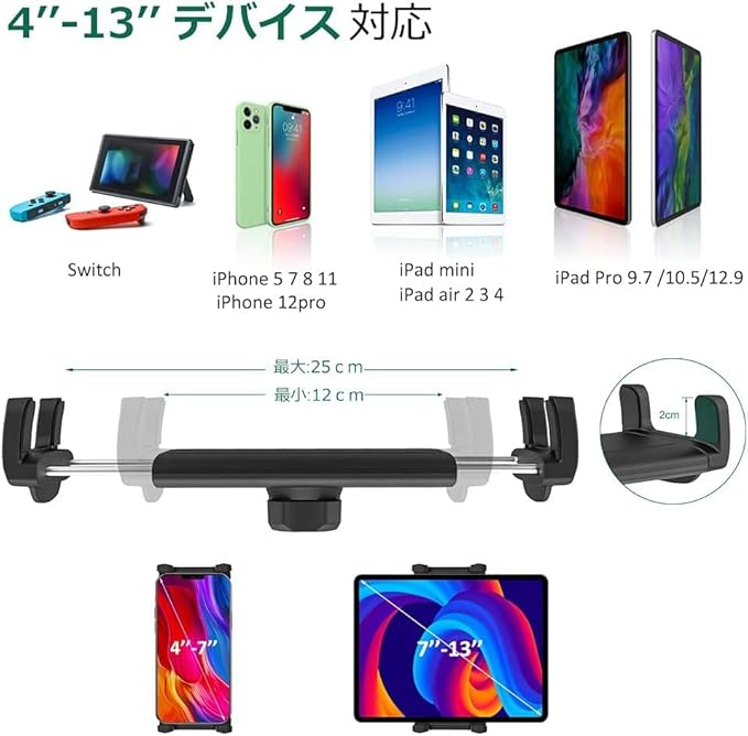 【タブレットとスマホ両用カーカップホルダー】この車載ホルダーブラケットは伸縮幅サイズが12〜25cmで、 すべての4〜13インチのデバイスに適合します。例えば: iPad Pro 12.9 11 10.5 10.2 9.7, iPad Air 4 3 2 1, iPad Mini 5 4 3 2 1, iPad 8 7 6 5 4 3 2 1, iPhone 13 Pro Max / 13 Pro / 12/ 11 / X / Xs / XR / Xs Max / 8 / 8 Plus / 7 / 6, Galaxy S20 S10 + / S10 / S9 + / S9 / S8 + / S8 / S7 / S6 / A80 / A70 / A60 / A9 / A8 /J7 / J6 など