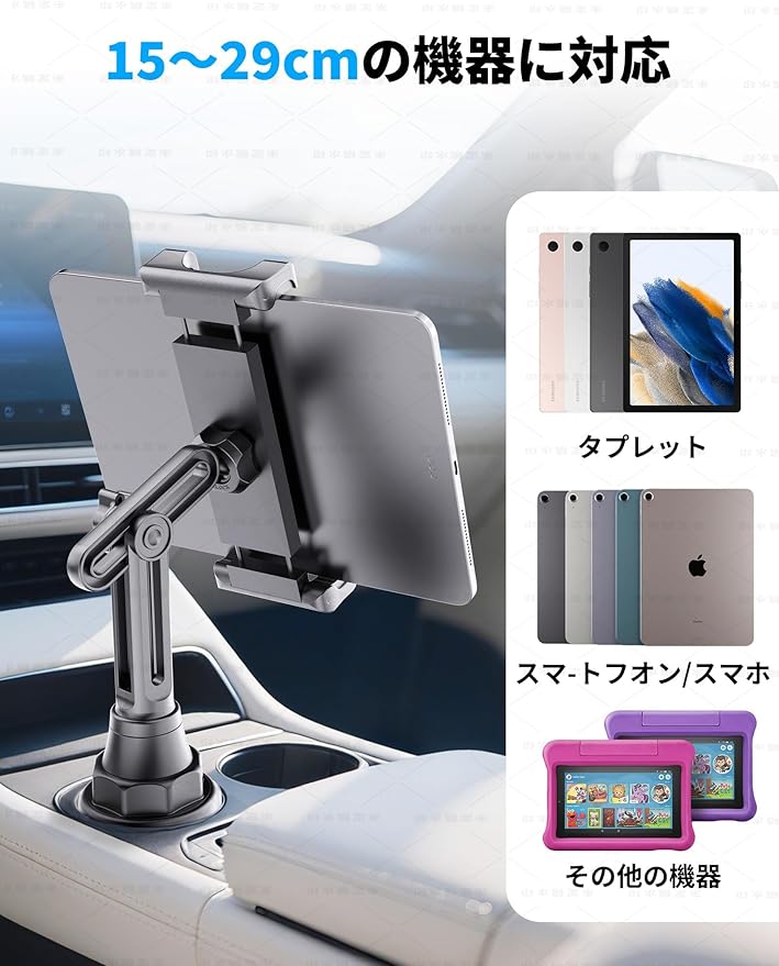 【タブレット&スマートフォン対応】: この車載カップホルダー用タブレットホルダーは、約15センチから29センチのデバイスに対応します。iPad Pro 12.9、11、10.5、10.2、9.7、iPad Air 4、3、2、1、iPad Mini 5、4、3、2、1、iPad 8、7、6、5、4、3、2、1、スマートフォンではiPhone 16、16 Pro、16 Pro Max、iPhone 15、15 Pro、15 Pro Max、iPhone 14、14 Pro、14 Pro Max、iPhone 13、13 Pro、13 Pro Max、iPhone SE、iPhone 12、12 Pro、12 Pro Max、iPhone 11、XS、XS Max、XR、X、8 Plus、8、7、7 Plus、6 Plus、6、Samsung Galaxy Note 20、S21、S21+、S20+、S20 Ultra、S10+、Tabs、Galaxy Note、Galaxy Sシリーズなど、さまざまな携帯電話やタブレットデバイスに対応しています。