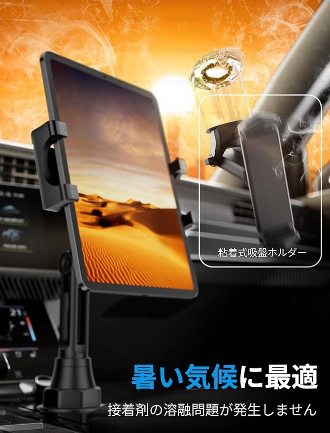 調節可能な広いベースと伸縮アーム: このタブレットホルダー車用には、約5.8センチから10.7センチまで拡張可能な調節ベースが含まれており、大部分の大きなラウンドカップホルダーに対応します。ボート、ゴルフカート、トラック、RVなどで使用するのに最適で、ソフトな滑り止めシリコンパッドと耐熱材料により、極端な天候条件下でもしっかりと固定されます。車タブレットカップホルダーとしての機能も備えています。