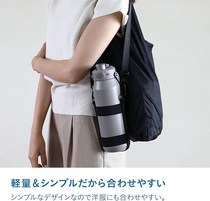 重さはわずか60g。軽くて持ち運びやすく、使わない時もかさばらずにバッグに収納できます。落ち着いたカラーでボトルのデザインを引き立てながら、洋服にも自然に馴染むスタイリッシュなデザインです