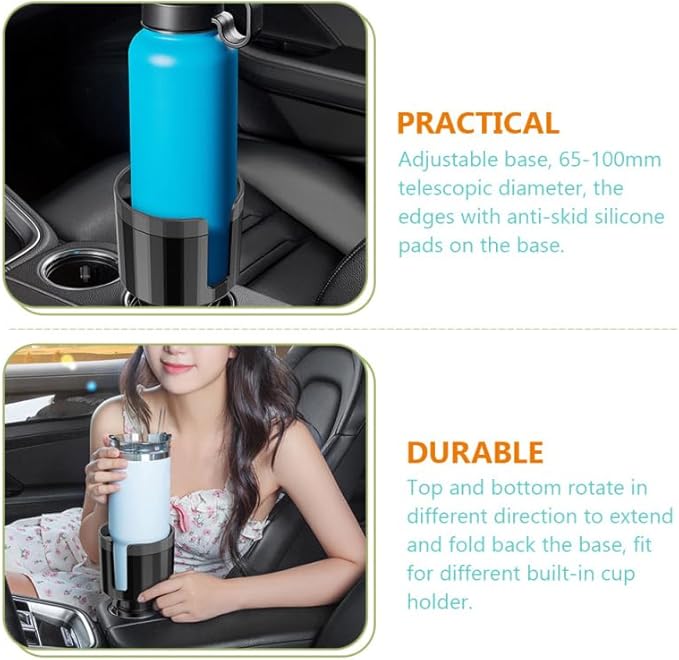 【調節可能なベース】65〜100mmの拡張可能ベース直径で、様々な車載カップホルダーに対応。滑り止めシリコンパッドが安定した支持を提供し、走行中の飲み物の滑落を防止します。