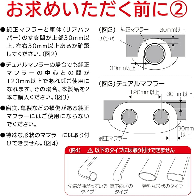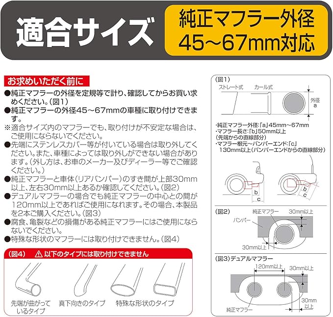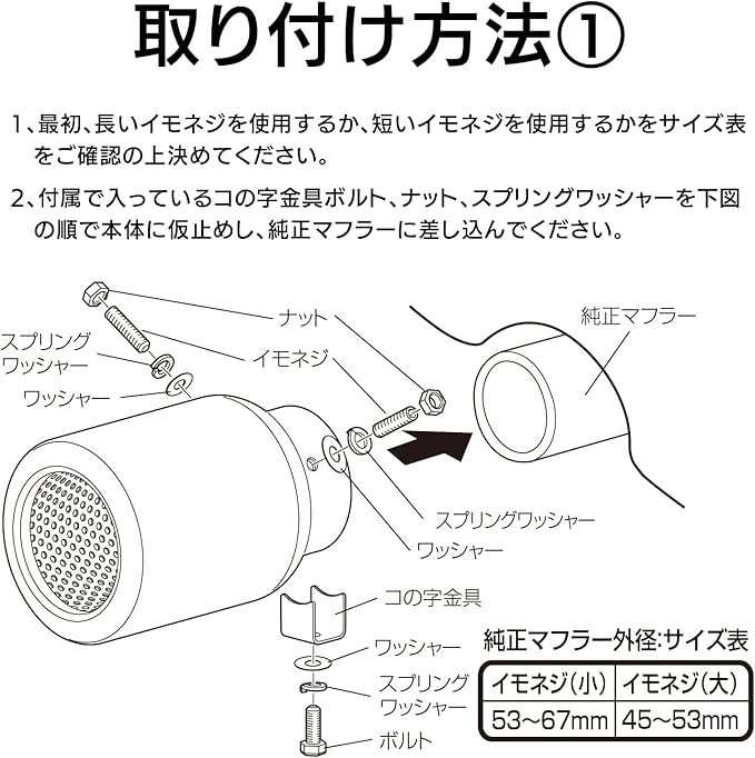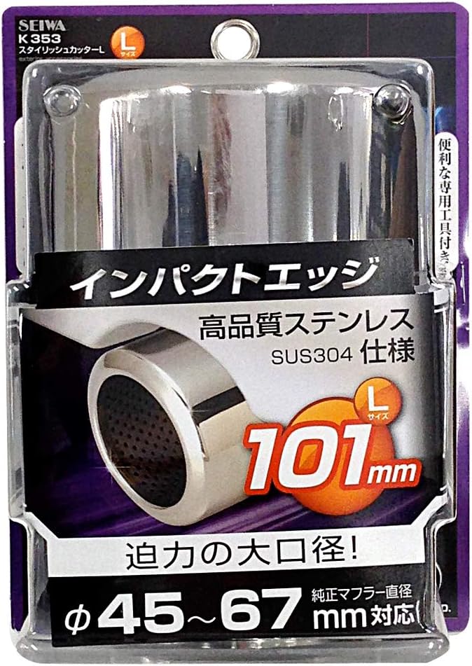 ●ボリューム感あふれるデザインで、リアビューの迫力とスポーティ感を大幅にUPさせます。 ●高硬度ステンレス(SUS304)使用で軽量で錆びにくいマフラーカッターです。 ●インナーメッシュによりスポーティ感を演出します。 ●特殊ネジ(イモネジ)2本とコの字金具で取りつけるので確実な取り付けが可能です。 ●特殊ネジ(イモネジ)を使用しているので、違和感のない装着が可能です。 ●付属工具付きなので取り付けの際、他の工具の用意の必要はありません。
