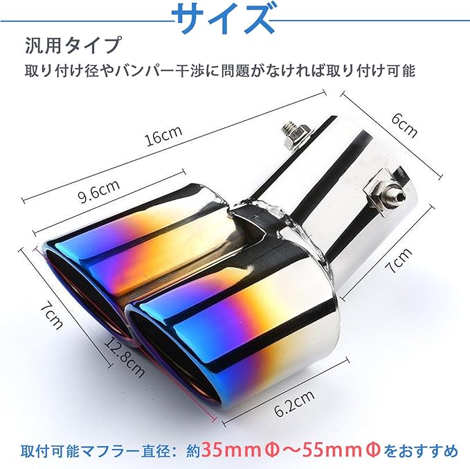 【車種対応】汎用タイプのため、取り付け径やバンパー干渉に問題がなければ取り付け可能です。取付可能マフラー直径:約35MMΦ~55mmΦ(排気量1.2~2.0Lの乗用車に使用可能)。基本的に車両を改造する必要はありません。ご注意:取り付けは買われる方の車に合うかどうかなので、事前に寸法をちゃんと測ってください。