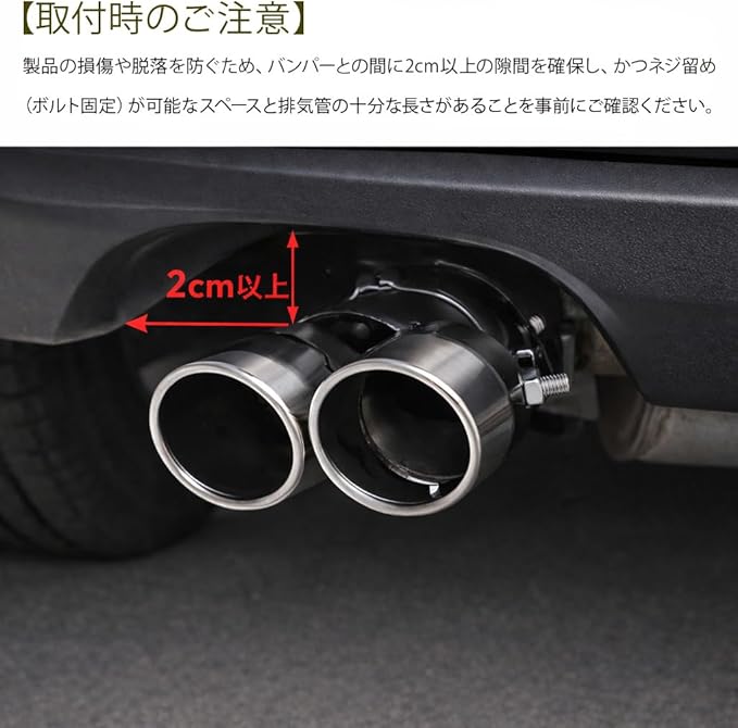 【取付時のご注意】製品の損傷や脱落を防ぐため、バンパーとの間に2cm以上の隙間を確保し、かつネジ留め(ボルト固定)が可能なスペースと排気管の十分な長さがあることを事前にご確認ください。