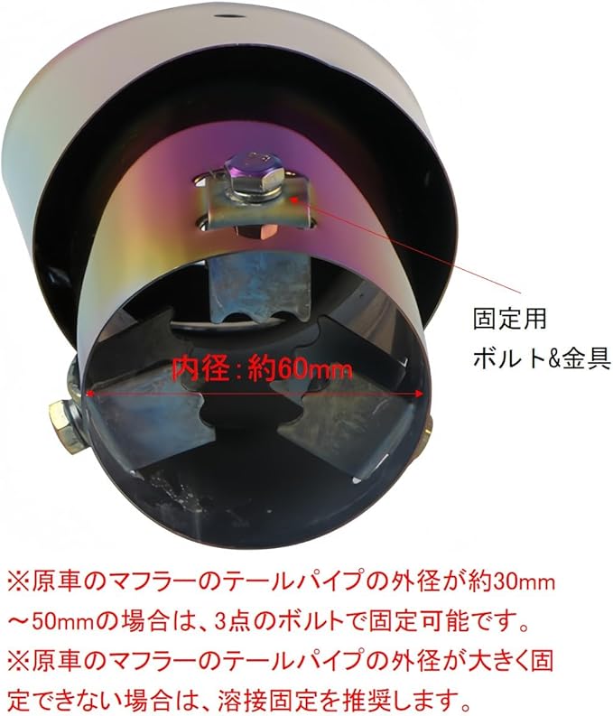 原車のマフラーのテールパイプの外径が約30mm~50mmの場合は、2点のボルトで固定可能です。