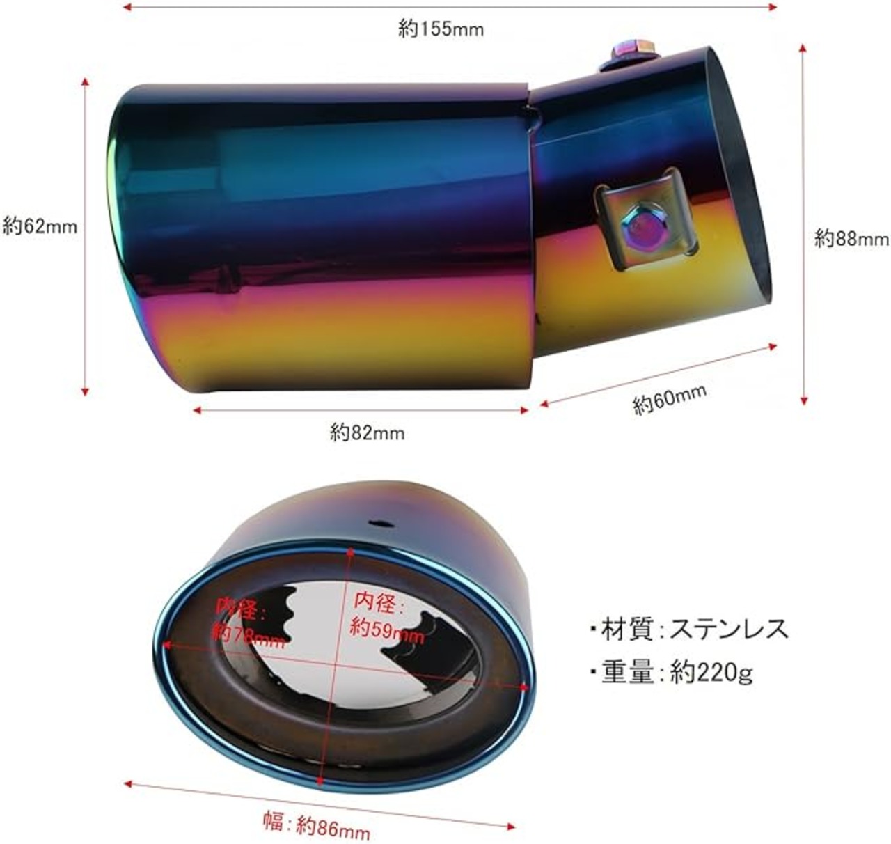 汎用マフラーカッター。下向きマフラー用。材質:ステンレス。サイズ:約(L)155mm (W)86mm (H)88mm。重量:約220g。