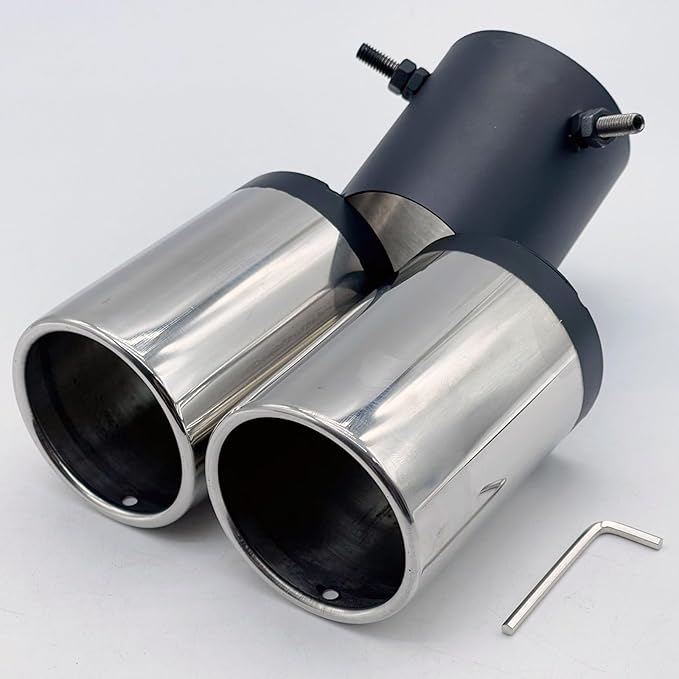 車のリアビューをカッコよく引き締め、高級感を演出するマフラーカッターです。迫力の2本出しタイプ。