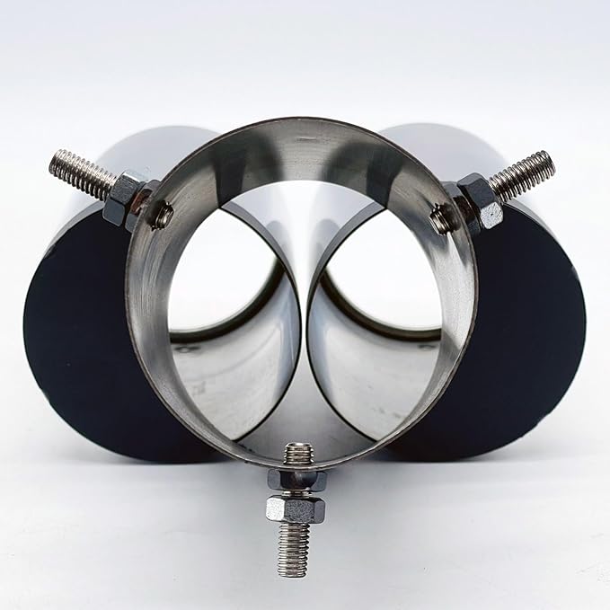 ボルト締め付けタイプで取り付けも簡単。取り付け可能な管外径は38mmから53mmです。必ずお車のマフラー形状をご確認ください。