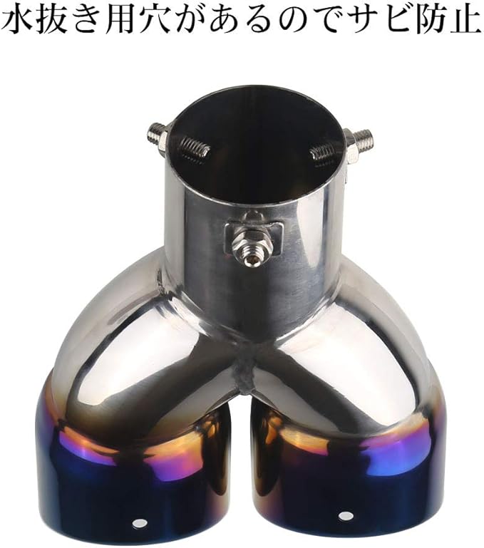 「錆びにくい」- ステンレスで作られて、錆びにくくて耐久性、耐食性に優れています。水抜き用穴があり、サビからこのデュアルマフラーカッターをしっかり守ります。