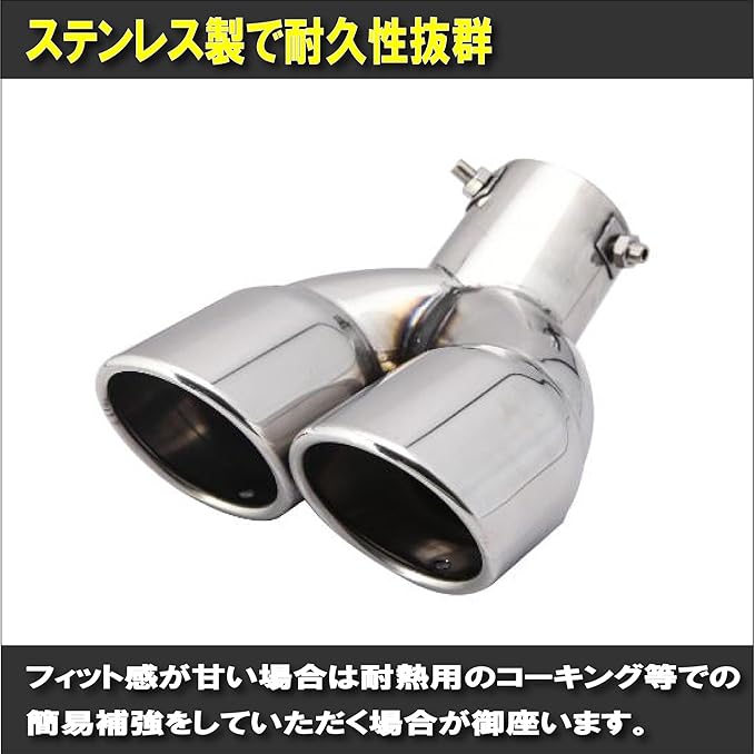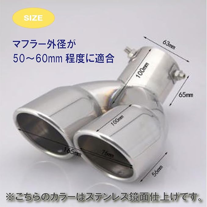 この商品は 【Monica james】 にて正式に登録している商品となります。 提携工場と連携して製造、販売を行っておりますので、似たような商品があった際は同じ商品では御座いませんのでご注意下さい。マフラー径 50~60mm/63~73mm に適合する下向き2本出しタイプのマフラーカッター です。材質はステンレスで製作しており、錆 等にも強く耐久性も抜群です。 本商品を取り付けをすることで高級感が増しスタイリッシュな外観にイメージチェンジします。取り付けは簡単で、既存のマフラーに差し込み3点のボルトで固定するだけなので女性の方でも取り付けが可能です。愛車のドレスアップ、及びカスタマイズ 等にいかがでしょうか。【商品内容】・本体 1個(排水加工済)【材質】 ・ステンレス製【サイズ】・マフラー差し込み部の外径が63mm/76mmの2種類をご用意しております。(内径は約60mm/73mmとなります。3本のボルトで押して固定するタイプであり、63mmタイプであればマフラー径50~60mm、76mmタイプであればマフラー径63~73mm、-10mm程度は調整が可能です)・その他の寸法は画像にて記載しておりますのでご確認下さい【カラー】・ブラックメタリック/ステンレス鏡面仕上げ/ブルー の3種類をご用意しております【対応車種】 ・マフラー差し込み部の内径が約60mm/73mmになりますので、サイズが合えば国外、国内車問わず様々な車種に取り付けが可能で御座います。 (マフラー周りの部分に干渉する恐れがありますので、詳細の寸法をご確認の上ご購入下さい)・【注意事項】・お車の状態によっては取り付けた際にフィット感が甘い(多少のガタやゆとり)可能性が御座います。その際は耐熱用のコーキング等での簡易補強をしていただく場合も御座いますのでご了承下さい・マフラー周りの部分に干渉する恐れがありますので、商品サイズ、及びお車のマフラー周りをご確認の上のご購入をお願い致します・説明書などは付属しておりませんのでご不安な方は専門業者様にご依頼下さい・取り付け箇所の清掃をしてから装着して下さい・輸入品の為、輸入時に付く多少の傷や汚れがある可能性が御座いますので予めご了承下さい。 【安心の品質保証】弊社製品は高品質を保つため、製造工場を厳選し、検品~梱包まで徹底管理しておりますので万全の状態でお客様の元へお届けしますが、万が一不良品が届いた場合には評価の前にご連絡下さい。
