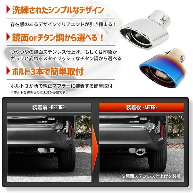 【安心の設計&車検対応】 落下防止用のワイヤー&パーツ付きで走行中の脱落を防止。 マフラーカッター本体は車体全長より内側に収まる設計で、日本の車検にも対応しています。