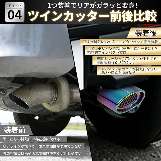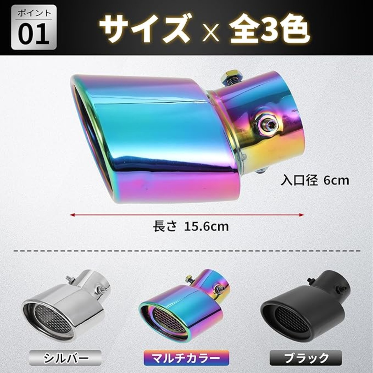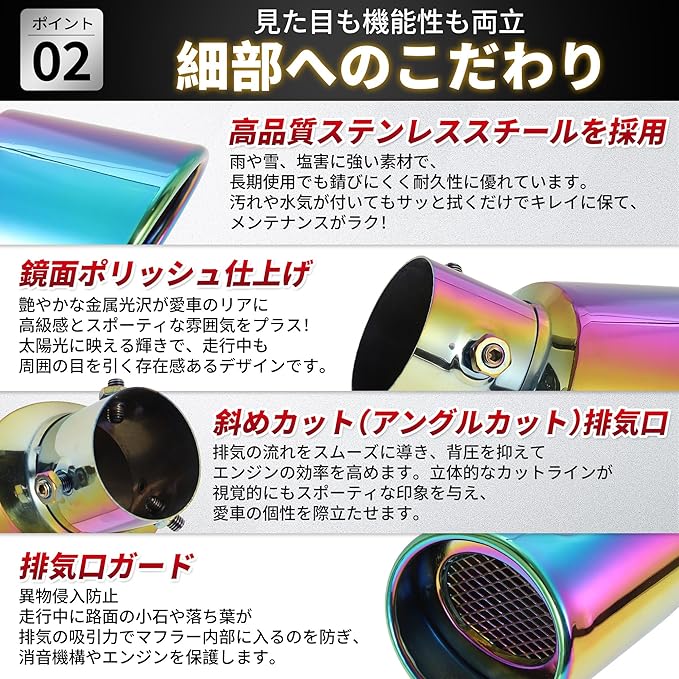 【多彩カラーで車両の個性を演出 スポーティー外観 UP】ステンレス原色・マットブラック・マルチカラーなど3色から選べる。純正の地味な尾喉を置き換えるだけで、車のリアデザインにスポーティーな高級感を加え、駐車場でも他の車と差をつけることができる。