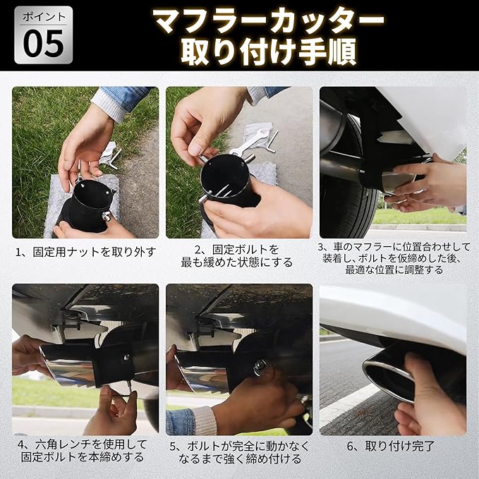 【工具 1 本で 5 分完成!DIY 初心者でも簡単取り付け】穴開けや溶接は一切不要!既存のテールパイプに差し込み、付属のボルトをレンチで締めるだけで固定完了。2~3 点式ボルト固定でガッチリホールドし、盗難や走行中の脱落を防止。週末のカスタム時間に気軽に装着できる。