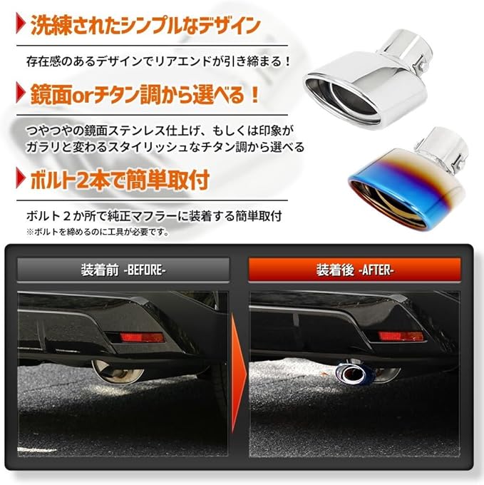 【安心の設計&車検対応】 落下防止用のワイヤー&パーツ付きで走行中の脱落を防止。 マフラーカッター本体は車体全長より内側に収まる設計で、日本の車検にも対応しています。
