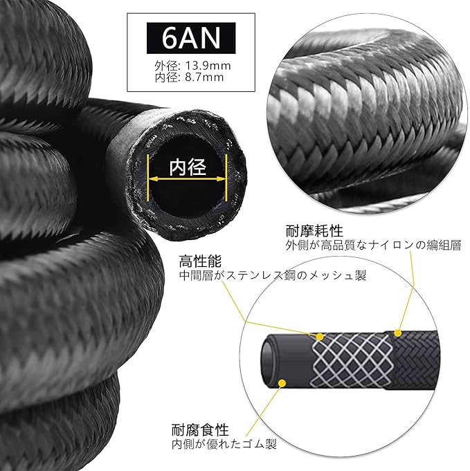 【商品仕様】:サイズ:AN6 長さ:1M 内径:8.7MM 外径:13.9MM 使用温度範囲:-40-148.9℃