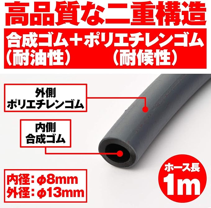 【仕様1】ガソリンホースは内側に耐ガソリン性に優れる合成ゴム、外側には耐候性に優れたポリエチレンゴムを採用