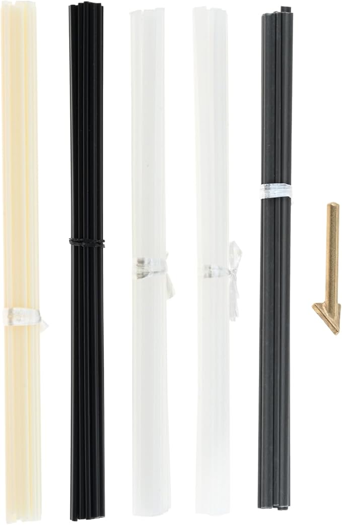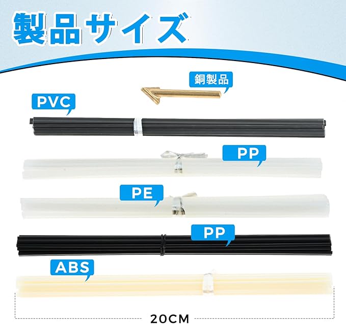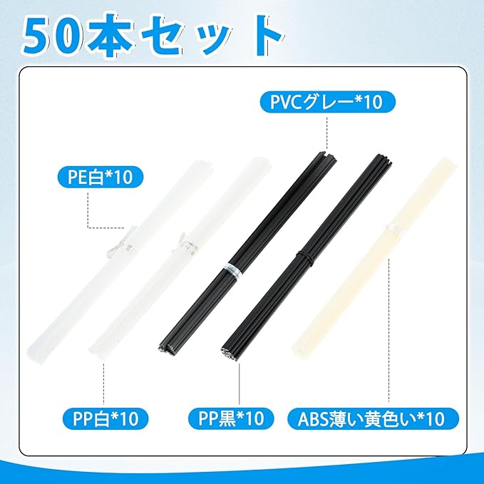 【セット内容】プラスチック溶接棒*50本(PP白*10本、PP黒*10本、ABS*10本、PE*10本、PVC*10本)、長さが約20cmです。三角形溶接頭*1です。
