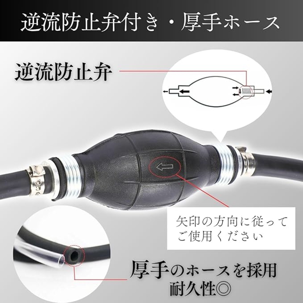 手動ポンプを数回押すだけで、液体がスムーズに吸い込まれ、反対側から出てきます。逆流防止用の逆止弁がついているため、ポンプに記載された矢印の方向に従ってご使用ください。