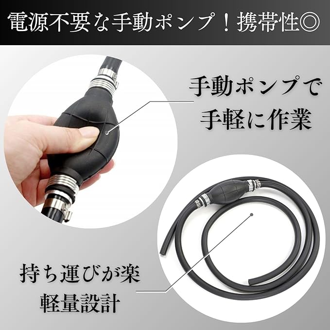電源不要の手動タイプで、軽量なため持ち運びも便利です。水槽の水交換やボートのオイル交換、灯油ポンプなど、ちょっとした作業に最適です。手元に1つあると大変役立つアイテムです。