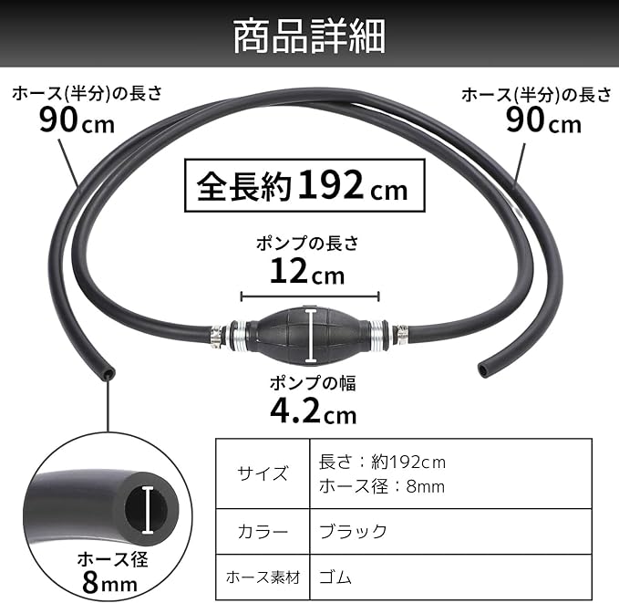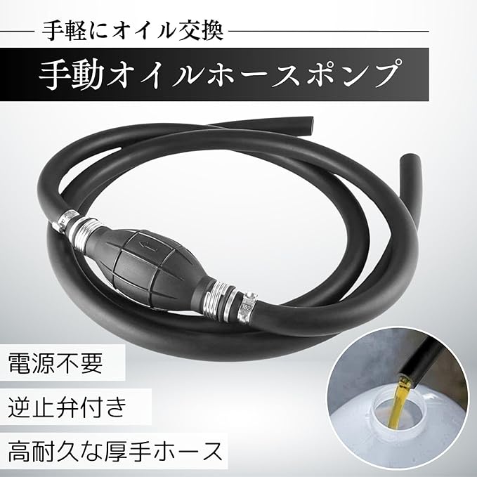 手動で使用するオイルポンプホースです。厚手のホースを採用していて耐久性があります。ゴム製の握りやすい給油ポンプを加圧することで、水やガソリン、オイルや灯油などの液体を簡単に供給・交換できます。