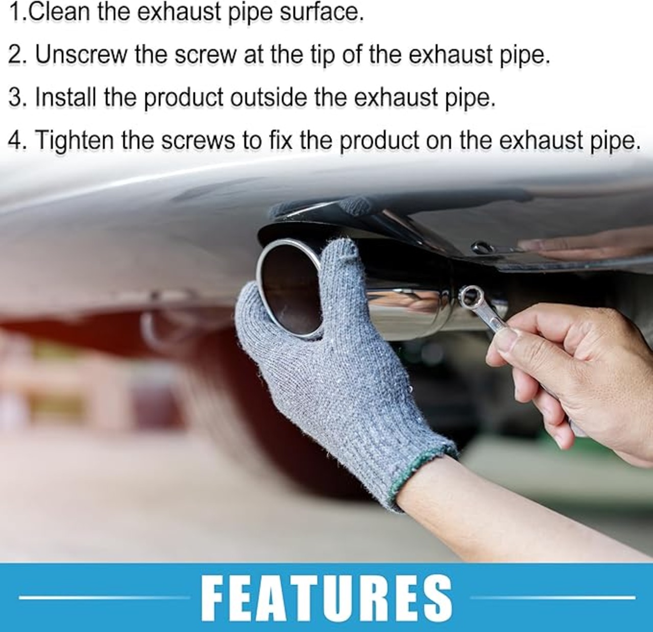 取り付け - 1. 排 気管の表面をきれいにします。2. 排 気管の先端のネジを緩めます。3. 製品を排 気管の外側に取り付けます。4. ネジを締めて製品を排 気管に固定します。