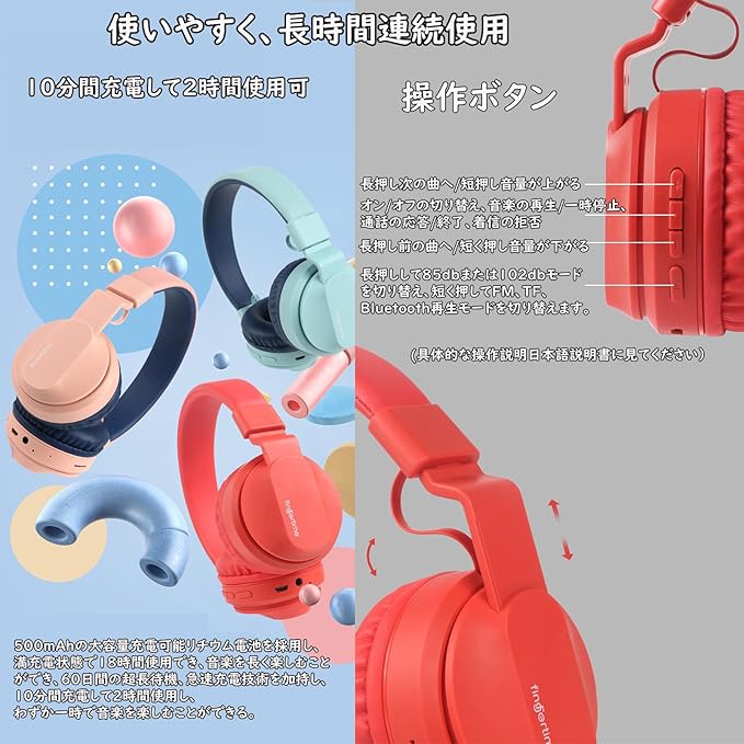 【使いやすく、長時間連続使用】500mAhの大容量充電可能リチウム電池を採用し、満充電状態で18時間使用でき、音楽を長く楽しむことができ、60日間の超長待機、急速充電技術を加持し、10分間充電して2時間使用し、わずか一時で音楽を楽しむことができる。操作ボタンを搭載し、子どもでも簡単に操作できます。