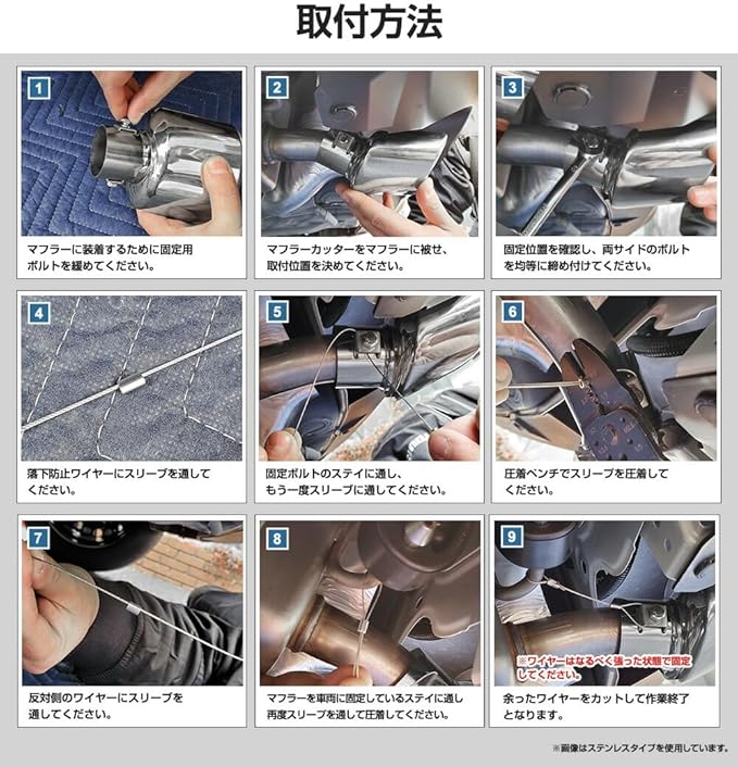 【安心の設計&車検対応】 落下防止用のワイヤー&パーツ付きで走行中の脱落を防止。 マフラーカッター本体は車体全長より内側に収まる設計で、日本の車検にも対応しています。