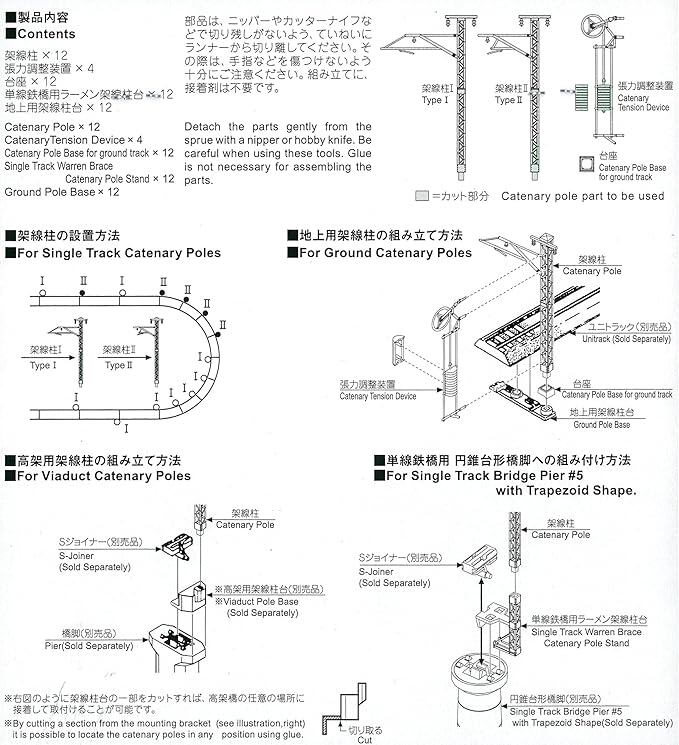 付属の単線鉄橋用ラーメン架線柱台を使えば、単線デッキガーター用架線柱として使え、架線柱台セット (23-056)を使えば、地上用/単線高架用としても使用可能です。