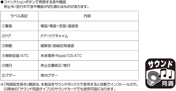 ファンクションボタンを押すことにより、乗降促進メロディ、ドア開閉、警笛、曲線区間通過など、地下鉄走行にまつわる様々なシーンを演出するサウンドを再現。